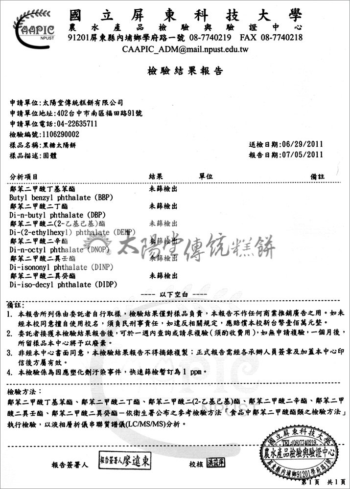 太陽堂傳統糕餅全數通過SGS及屏科大檢驗合格